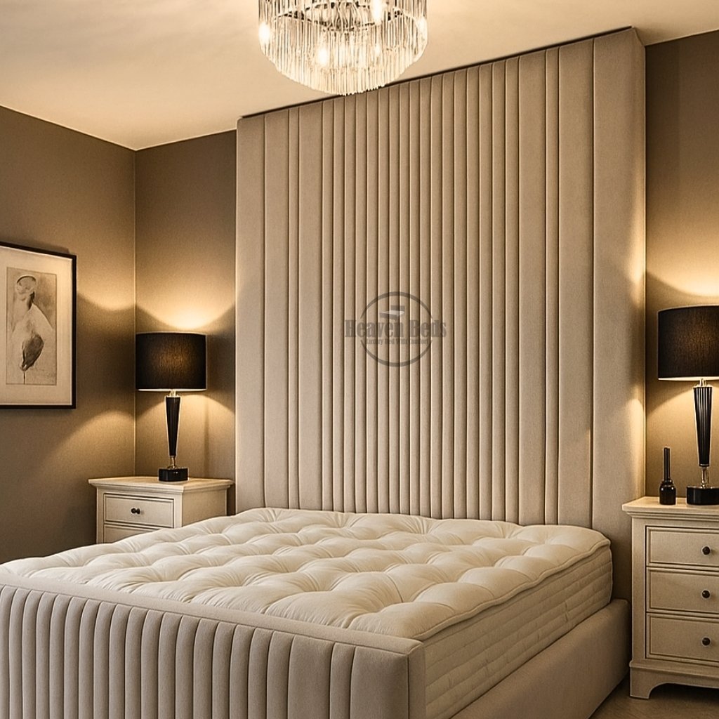 Architectural, refined, and quietly dramatic the adrian Luxury Bed elevates entire bedrooms with its tall, vertically fluted headboard. This fluted headboard bed creates strong sense of height and symmetry, giving the room composed, high-end presence without overpowering it.