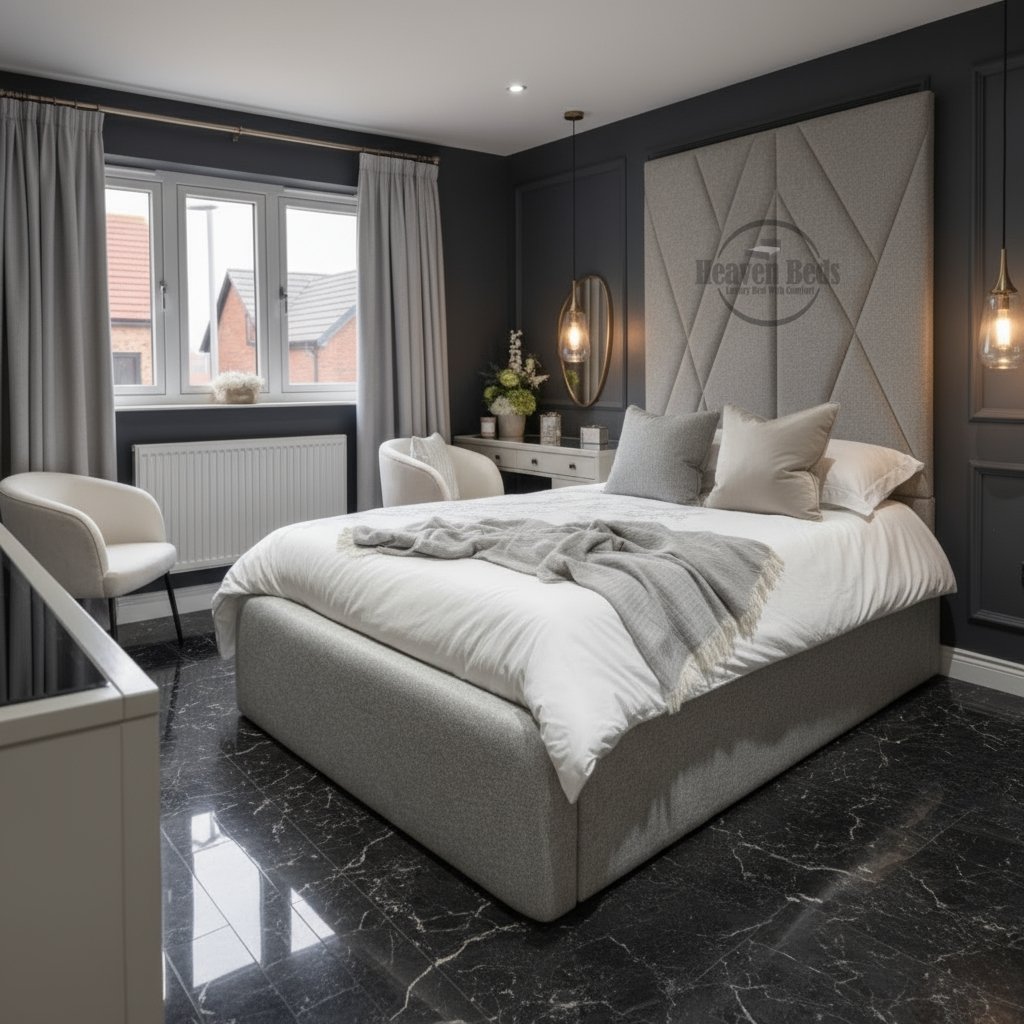 As a luxury upholstered bed, it offers excellent support when sitting up for reading or relaxing. The two piece headboard bed construction makes installation practical in UK homes with stairs or narrow access. Add optional ottoman storage bed and this tall headboard bed becomes as functional as it is impressive a modern luxury piece that fits naturally into contemporary British homes.