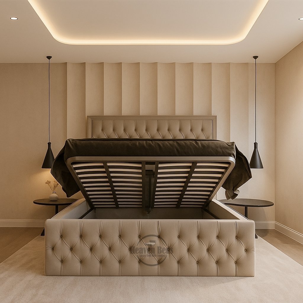 The deeply padded, button tufted upholstered bed design offers excellent back support when sitting up, while the plush upholstery enhances warmth and texture throughout the room. Built on a solid frame, the Dover is available with an ottoman storage bed UK option adding generous hidden space without compromising its elegant appearance.