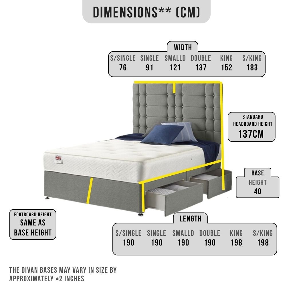 All measurements are in centimetres (cm) and based on standard UK divan bed sizing. Slight tolerances may apply due to upholstery.