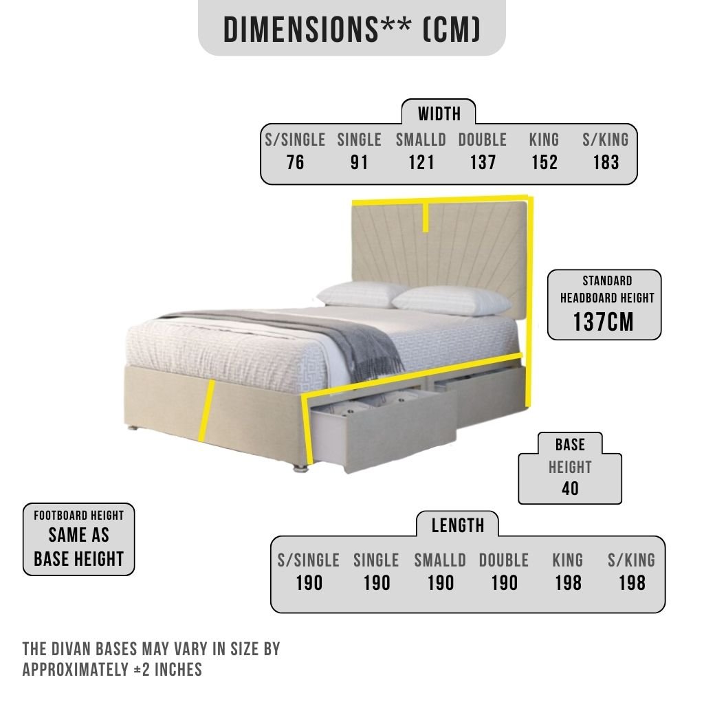 All measurements are provided in centimeters (cm) and reflect standard UK divan bed sizing. Minor variations may occur due to upholstery.