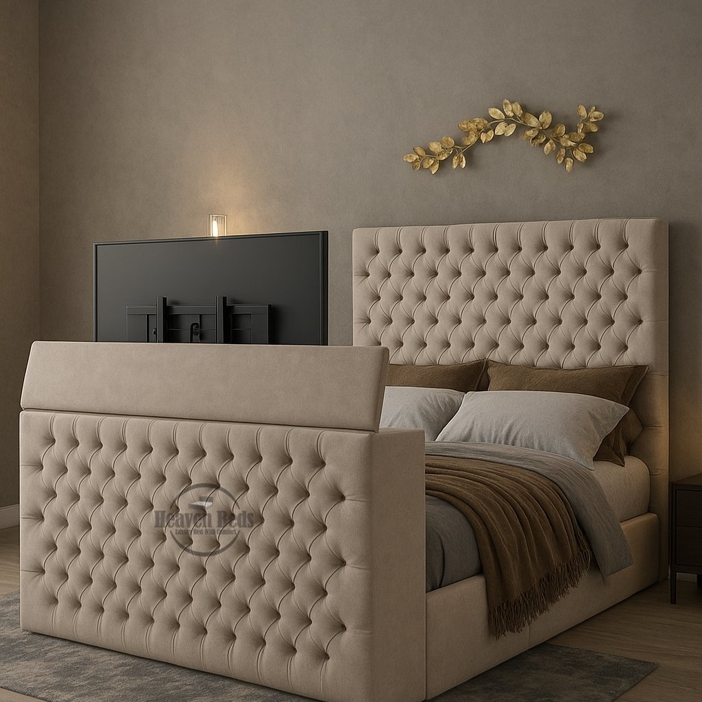Designed for modern UK bedrooms, the Oak Upholstered TV Bed Frame blends everyday comfort with smart technology and optional storage. The soft button-tufted bed design adds a classic touch, while the integrated TV footboard keeps your screen neatly hidden when not in use, maintaining a clean and organised look. As an upholstered TV bed, it suits both contemporary and traditional interiors without feeling bulky or overdesigned.
