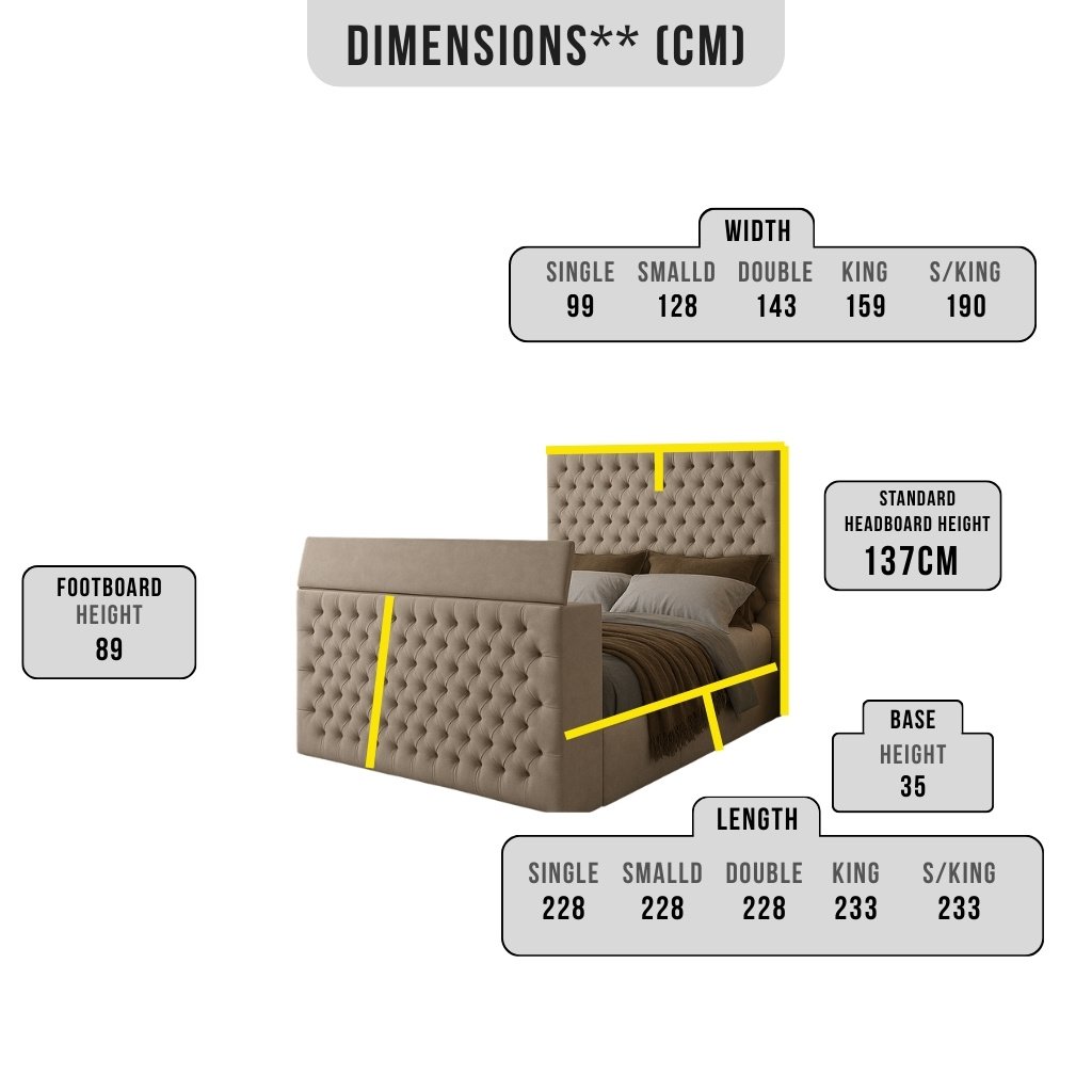 All measurements are shown in centimetres (cm) and reflect standard UK sizing for TV bed frames. Minor tolerances may occur due to upholstery and fitting.