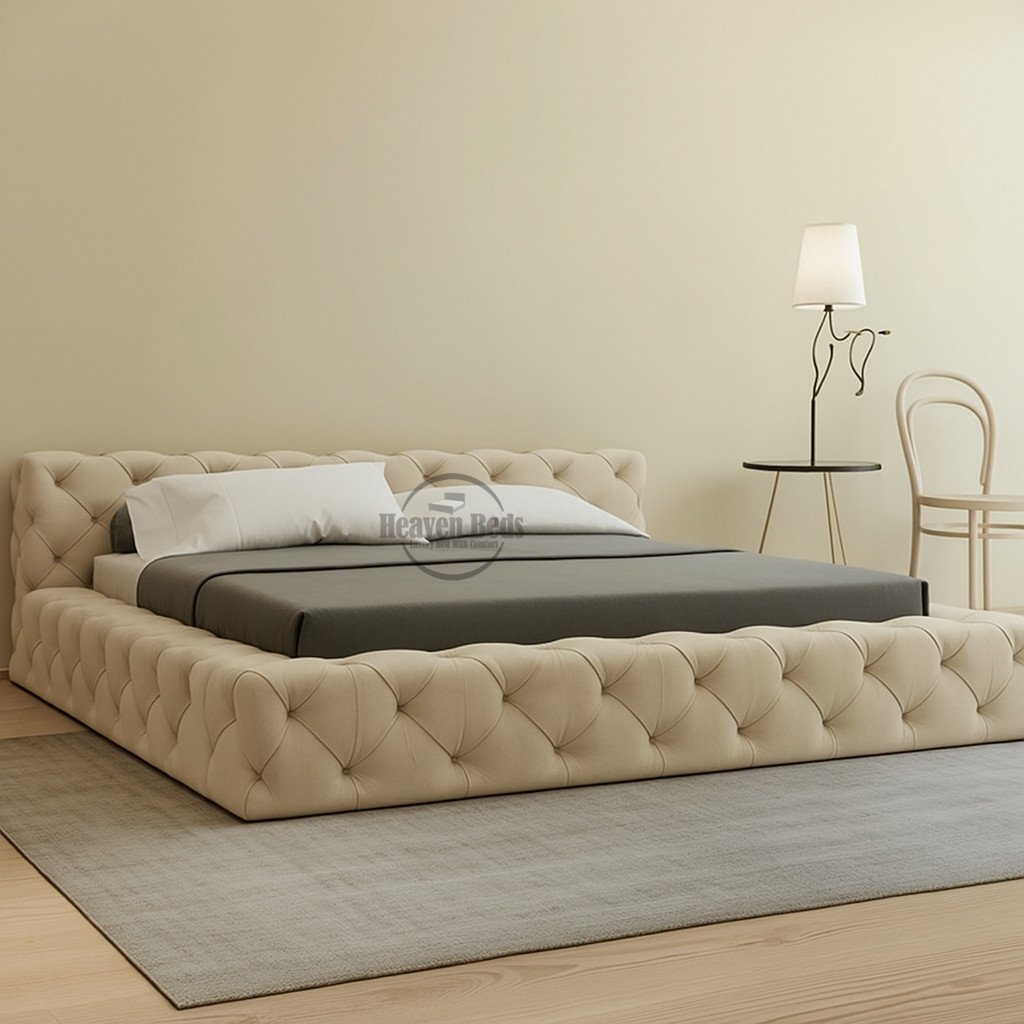 The Slumberly bed is a low, wide upholstered bed built for comfort and stability rather than decoration. Its deep, cushioned frame sits close to the floor, giving the bed a grounded feel that works well in modern UK bedrooms. The soft tufted upholstery runs across the headboard, sides, and base, creating a uniform finish that feels substantial without looking bulky.