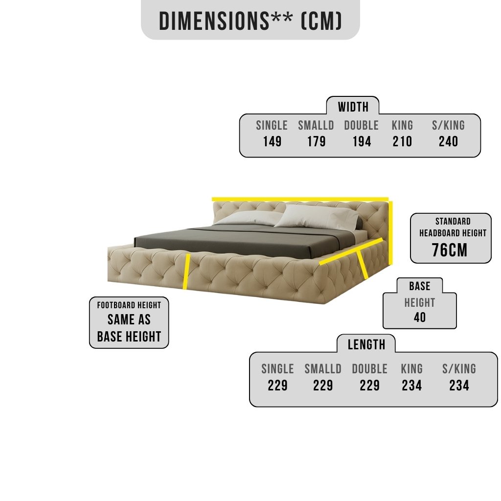 - Upholstered bed frame – fully padded across the headboard, sides, and base for a soft, consistent finish