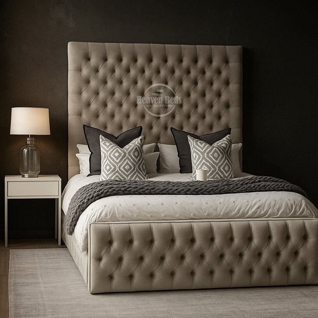 A tall tufted bed features a higher headboard with button or panel tufting. The Snooze Hub’s tall headboard adds back support and creates a clear focal point in the bedroom.