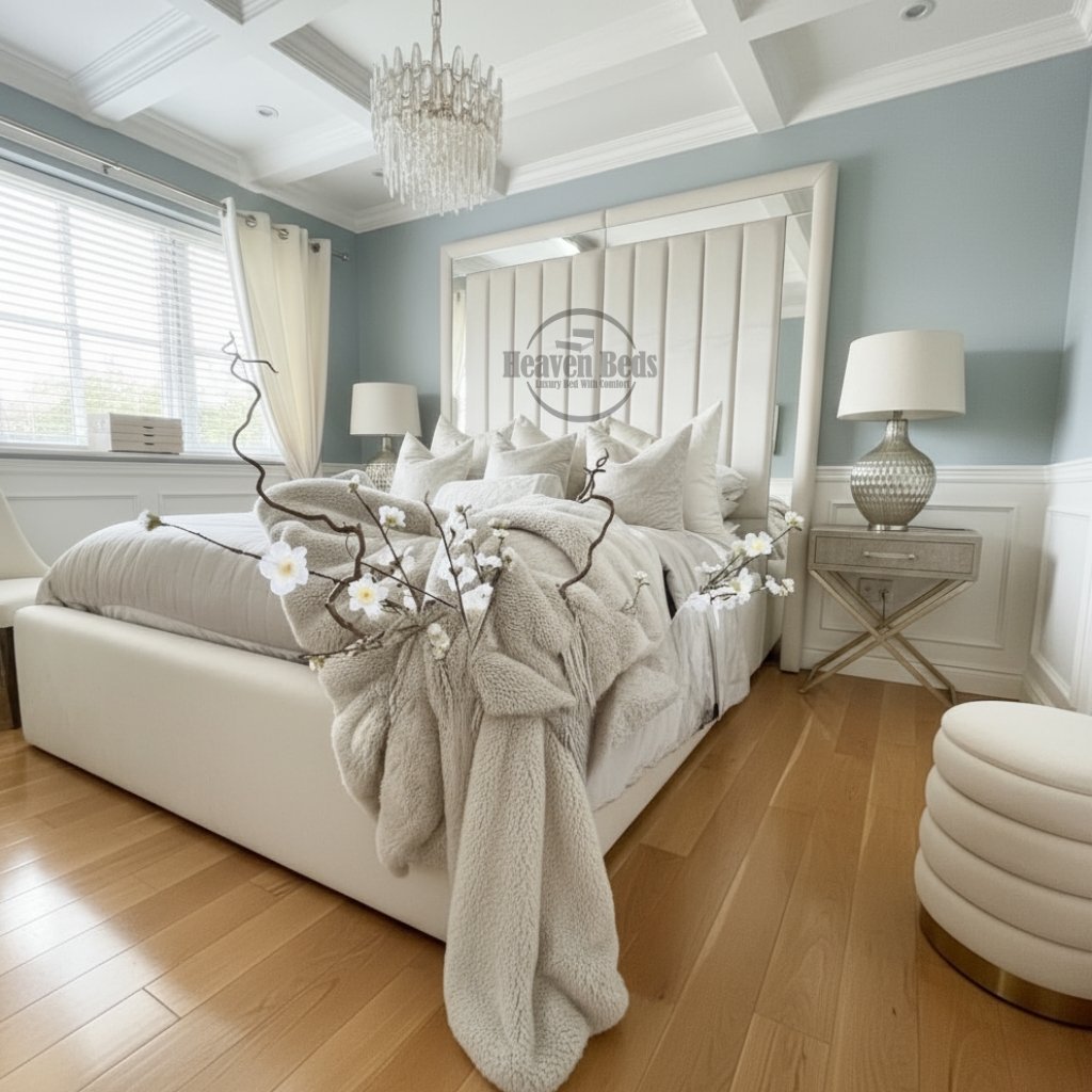 UK bedrooms often benefit from furniture that adds light rather than bulk. This tall headboard bed does exactly that—mirrored panels help bounce light around room, making spaces feel more open. Particularly effective in north-facing bedrooms or basement conversions where natural light is limited.