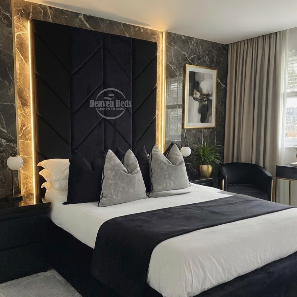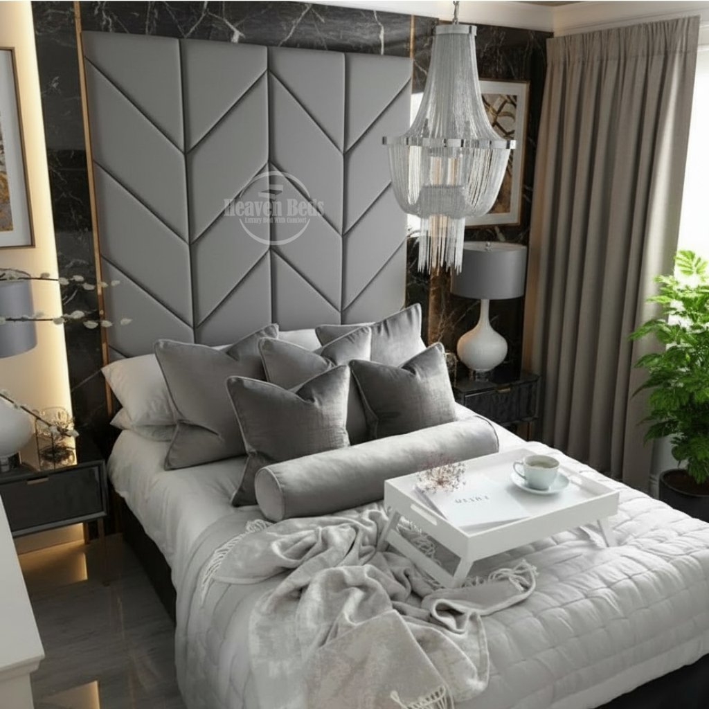 - Tall two-piece headboard – adds height and structure without heavy detailing